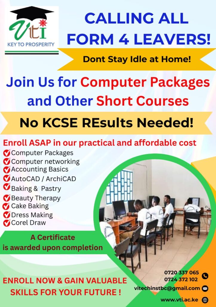 Welcome to Vitech Training Institute , we offer different courses at Artisan,Certificate and Diploma Levels. Our Examination includes KNEC, NITA & TVET CDACC.